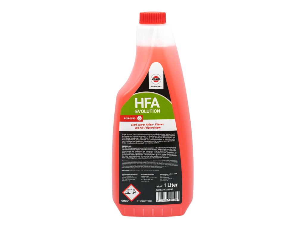HFA EVOLUTION je vysoko koncentrovaný, silne kyslý čistič určený na umyvárenské haly, obklady, hliníkové disky a puklice. Vďaka novej, vylepšenej formulácii spoľahlivo odstraňuje vápenaté usadeniny, hrdzu, olej, vosk aj pripálený brzdový prach.