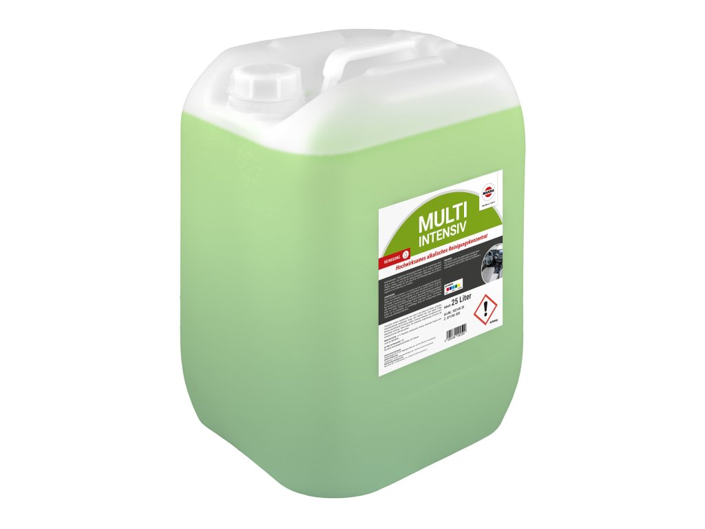 MULTI INTENSIV je silný alkalický čistiaci koncentrát s výbornou schopnosťou rozpúšťať tuky, oleje a odolné nečistoty. Je šetrný ku gume a plastovým dielom, vďaka čomu je vhodný pre použitie v interiéri aj exteriéri vozidiel.